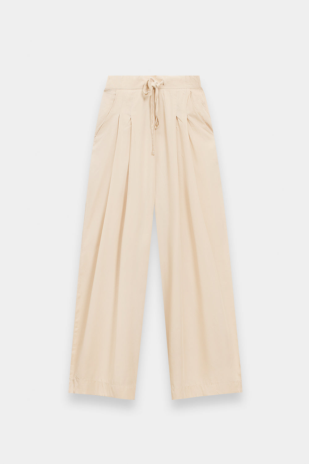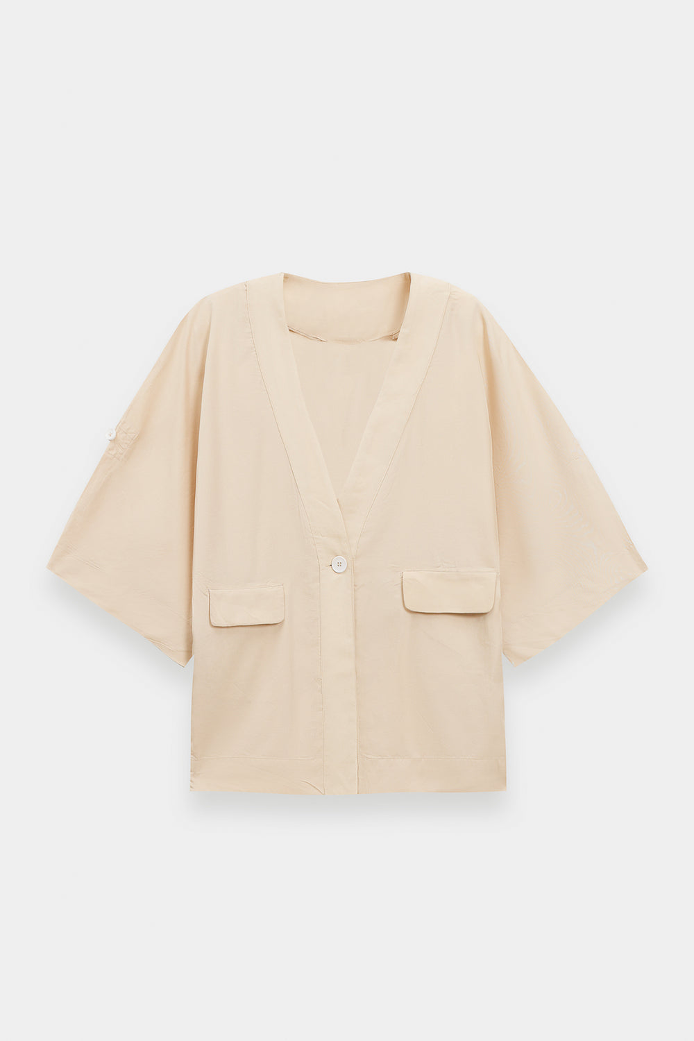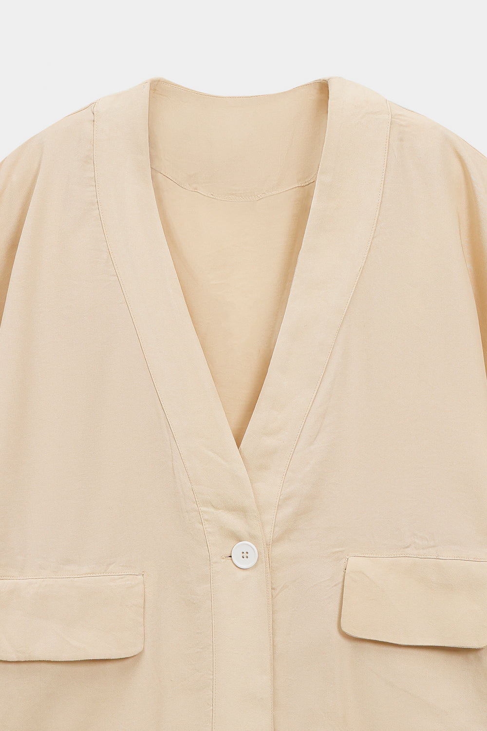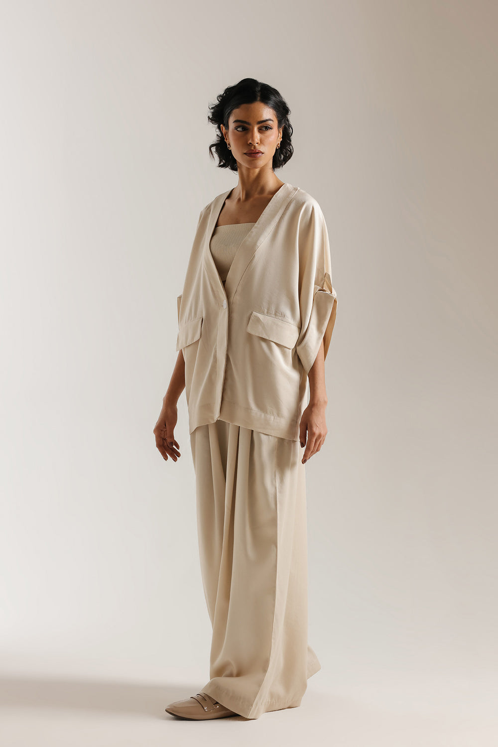 Step into a world of understated luxury with this ethereal two-piece ensemble, rendered in a champagne ivory. The centerpiece of this set is the kimono-inspired wrap shirt, featuring a deep V-neckline, creating a sense of effortless drape. Designed with contemporary utility in mind, the shirt showcases prominent flap pockets at the waist and unique, wide-cut sleeves with cuffed detailing. The raw, slightly frayed hemline provides a subtle, edgy contrast to the garment’s polished sheen. The look is harmoniously balanced by voluminous wide-leg trouser, which offer a fluid and comfortable fit while maintaining a high-fashion profile. Whether attending a sophisticated gallery opening or an intimate dinner gathering, this monochromatic suit ensures a presence that is both minimalist and undeniably radiant.