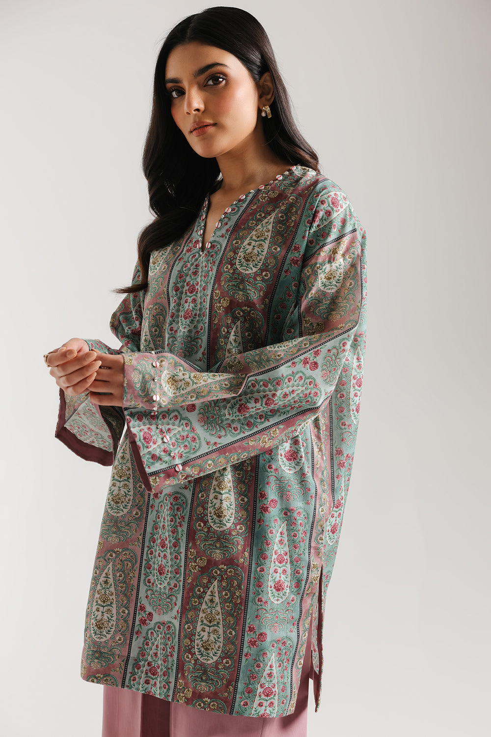 This artfully curated ensemble celebrates traditional block-print craftsmanship with contemporary styling. The mid-length kurta showcases an intricate floral and paisley pattern arranged in vertical kali panels, creating a flattering lengthening silhouette. A harmonious palette of teal, mint green, and dusty rose tones provides sophisticated visual depth, while the relaxed V-neckline and generously flared sleeves deliver effortless bohemian elegance. The coordinating straight-cut, wide-leg trousers in complementary dusty pink seamlessly echo the print's warm undertones, establishing a cohesive, refined aesthetic.