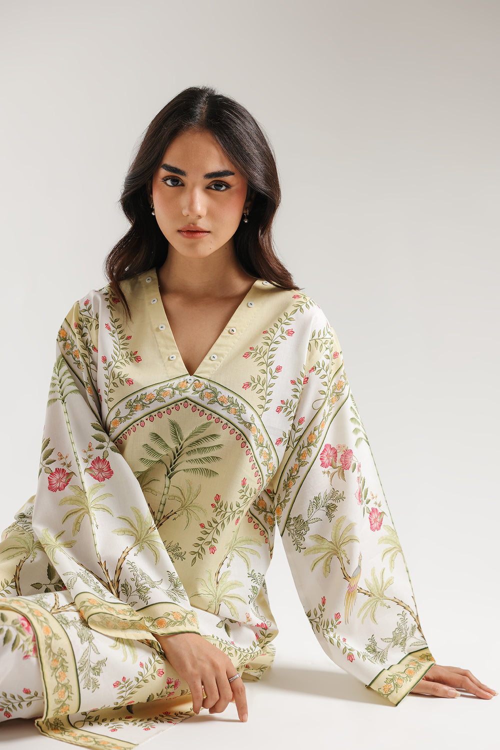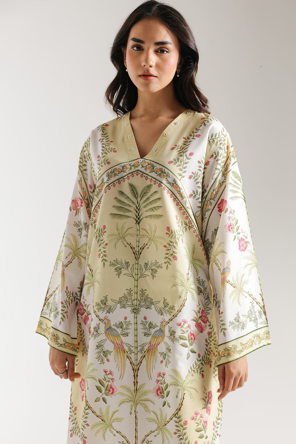 Exude an air of tropical serenity with this two-piece printed suit in soft yellow. The long-line shirt is centred by a striking symmetrical print featuring a tall palm tree motif, framed by delicate pink floral clusters and exotic birds. A crisp V-neckline with subtle button detailing leads into a relaxed silhouette with wide, flared sleeves, all finished with a decorative green and yellow geometric border. The ensemble is perfectly coordinated with straight-cut trousers that mirror the botanical theme, featuring vertical floral sprays and a matching patterned hem for a cohesive, refreshing look.