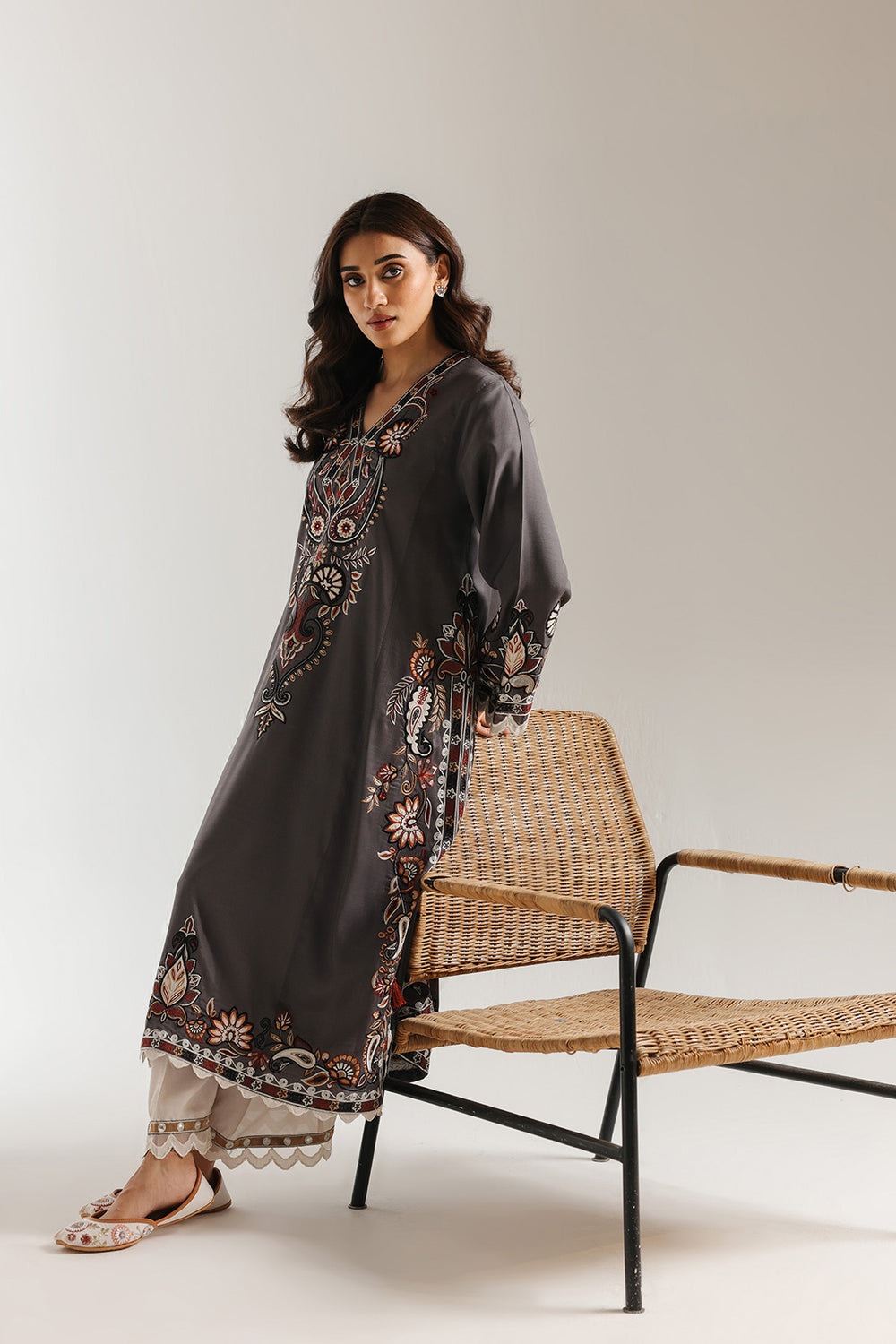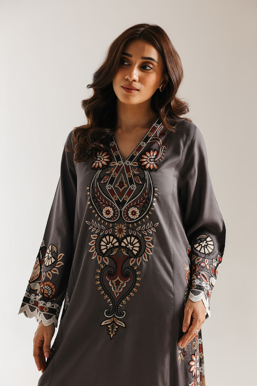 Exude artisanal grace with this exquisite charcoal grey embroidered suit. This sophisticated two-piece ensemble features a long-sleeved kurta in a rich, warm grey tone, acting as a stunning canvas for its intricate detailing. The centerpiece of the design is the elaborate floral and paisley embroidery that beautifully frames the V-neckline and cascades down the center, rendered in a palette of burnt orange, ivory, and deep black. Both the sleeve cuffs and the hemline are finished with delicate scalloped edges, adding a refined and feminine touch to the silhouette. Completing the look are coordinating off-white trousers, which feature matching scalloped lace detailing at the ankles for a polished and cohesive aesthetic. Whether attending a festive celebration or a formal evening gathering, this suit offers a timeless blend of traditional craftsmanship and modern elegance.