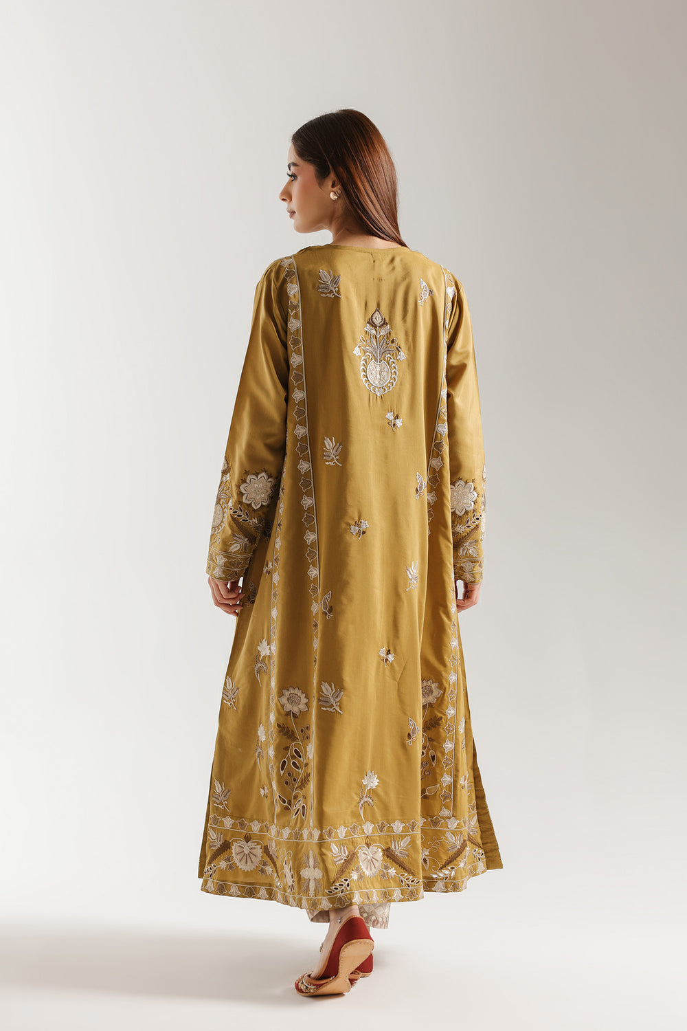 Infuse your festive wardrobe with a sense of royal opulence with this breathtaking two-piece ensemble, rendered in a rich mustard gold. The shirt is a masterclass in artisanal scale, featuring a voluminous A-line silhouette that serves as a grand canvas for intricate tonal and cream embroidery. Crafted for grand celebrations and evening soirées, this suit offers a presence that is both historically inspired and undeniably modern.